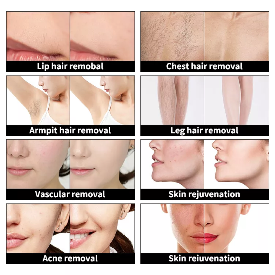 6 - Una máquina satisface todas sus necesidades, depilación (rostro, axilas, cuerpo y bikini), cuidado de la piel (vascular, acné y rejuvenecimiento de la piel), eliminación de tatuajes y lifting de piel.