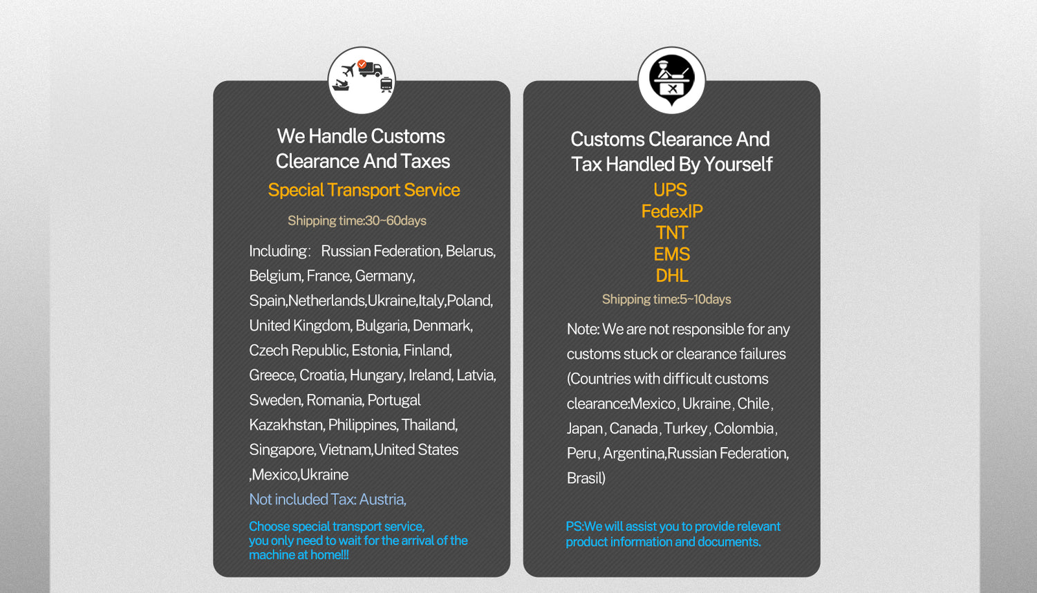 We have logistics partners to help you with customs clearance and tax payment, door-to-door service, if you need this service, please consult our customer service